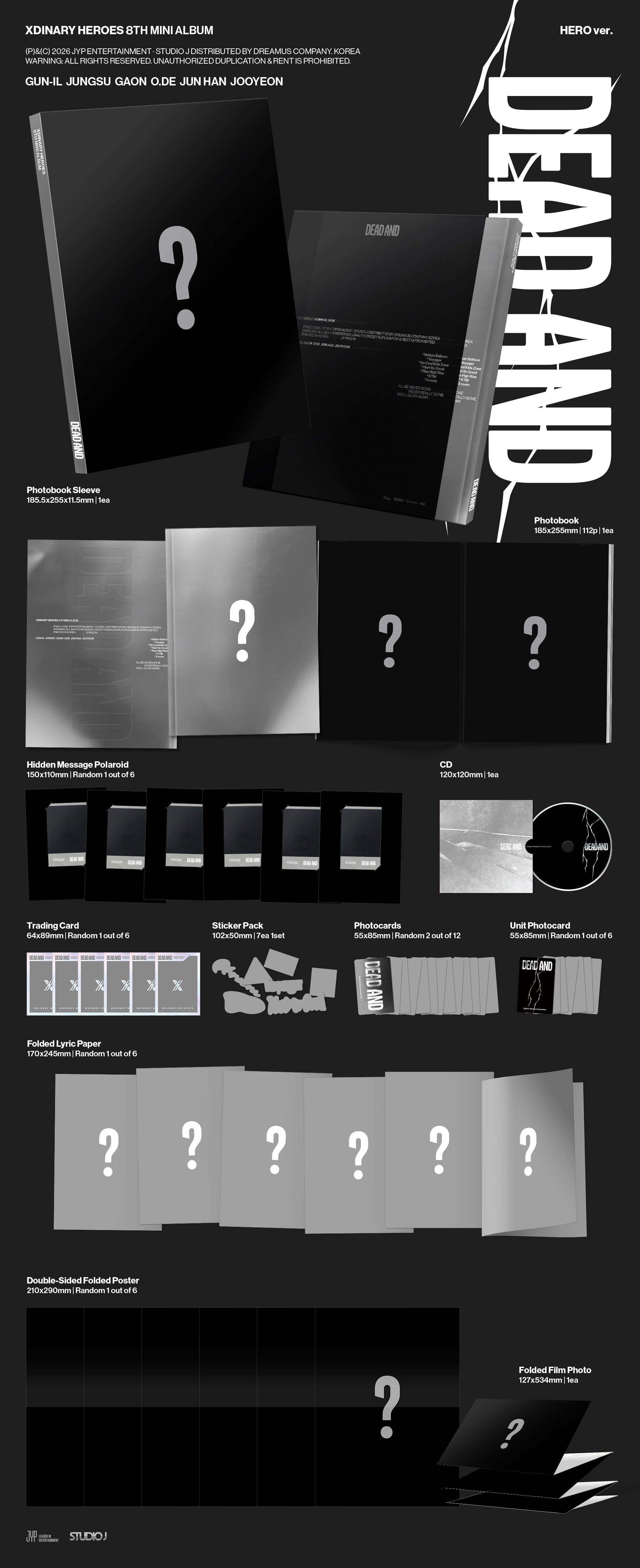 Xdinary Heroes (Gun-il, Jungsu, Gaon, O.de, Jun Han, Jooyeon) return with their 8th Mini Album ‘DEAD AND’ available in 2 versions: Boy in Chic ver. and HERO ver. Contents of the album include: CD, Photobook (112pg), Photobook Sleeve, Hidden Message Polaroid (1 of 6), Trading Card (1 of 6), Sticker Pack (1set / 7ea), Photocards (2 of 12), Unit Photocard (1 of 6), Folded Lyric Paper (1 of 6), Double-sided Folded Poster (1 of 6), Folded Film Photo. Dimensions: 255 x 186 x 12 mm.